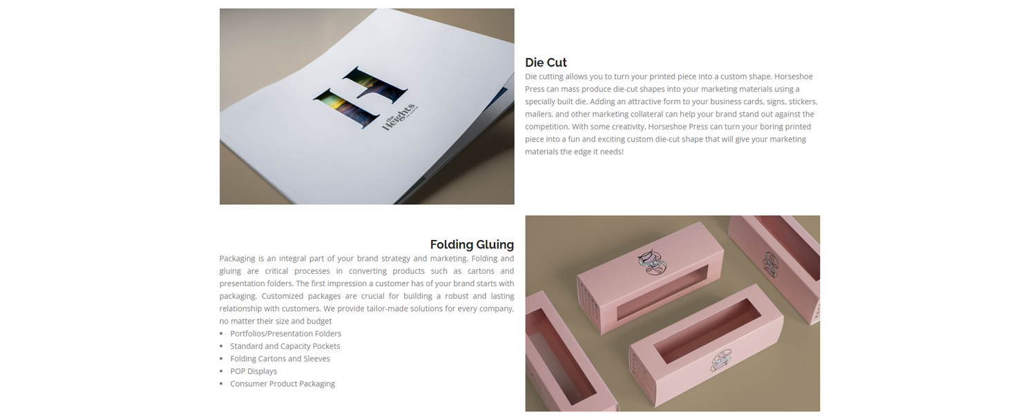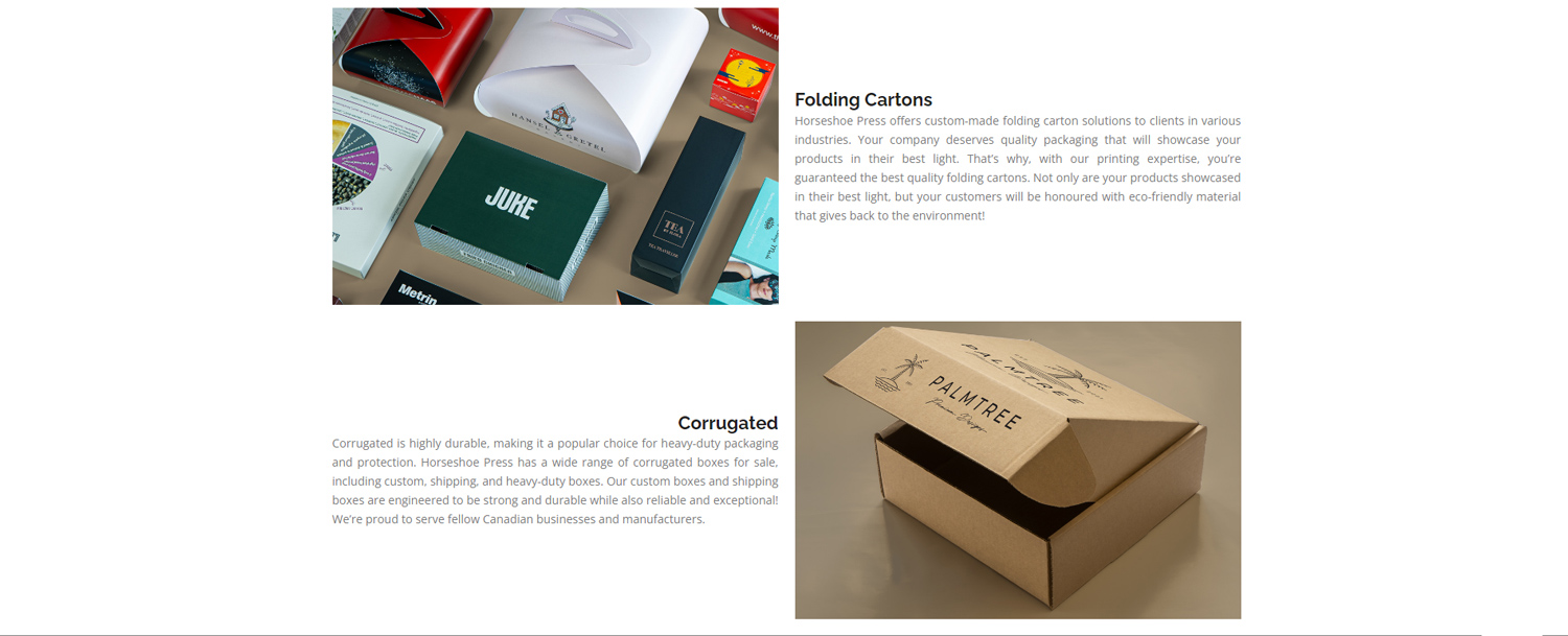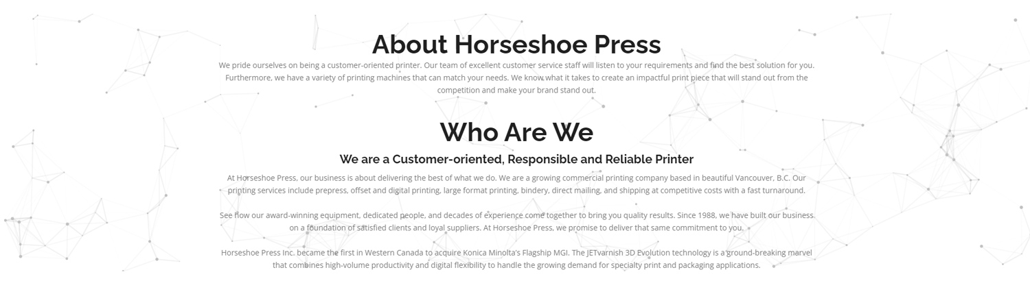 This website will effectively showcase Horseshoe Press' capabilities as a commercial printing company, attracting potential clients, collaborators, and industry professionals who value quality and reliability in their printing needs. The addition of videography elements will further enhance the website's visual appeal and provide a comprehensive overview of Horseshoe Press' services.